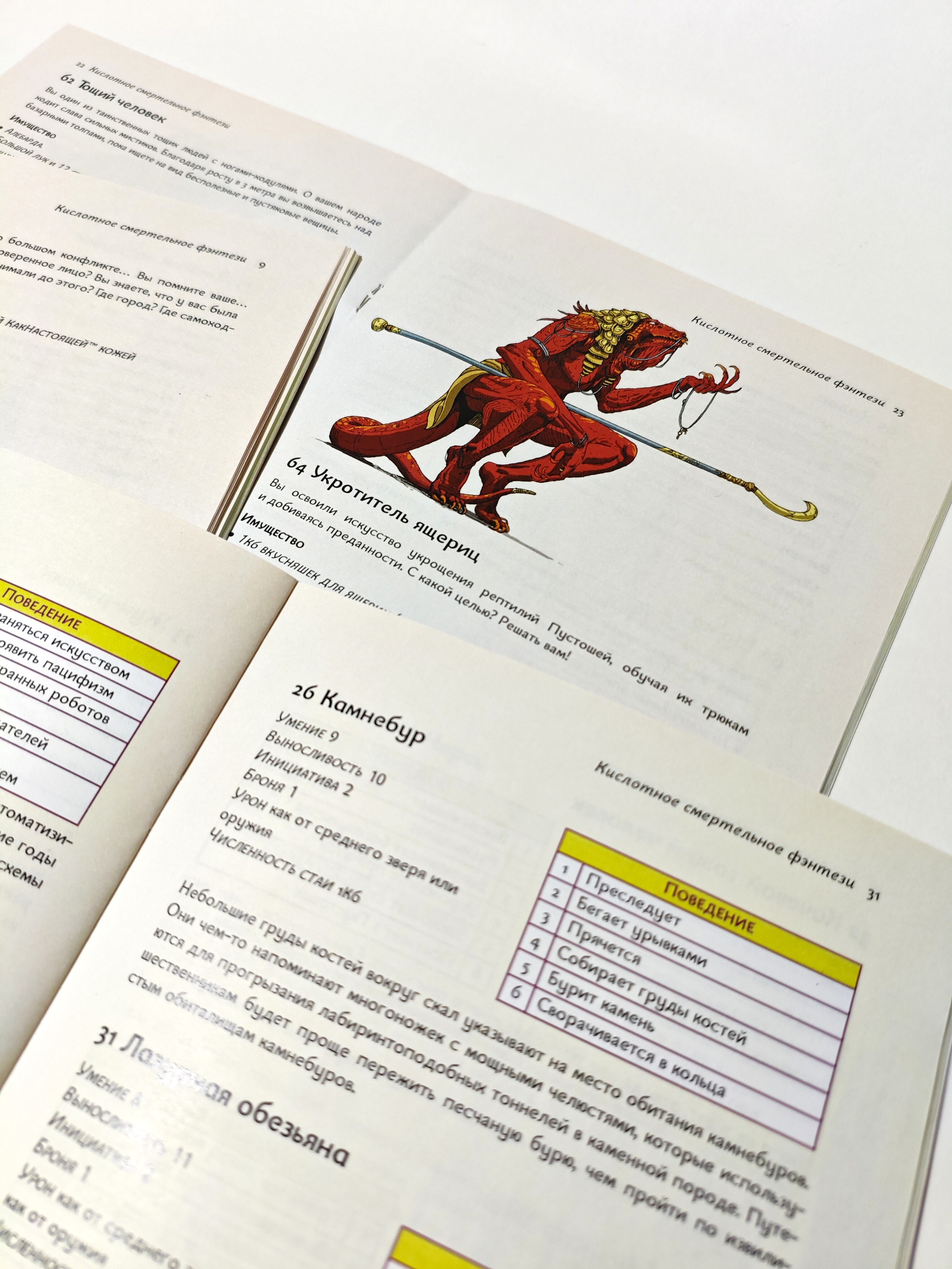 «Кислотное смертельное фэнтези» — дополнение для «Тройки!». В нём вы найдёте 49 страниц новых возможностей: описания планеты и инструмент для создания мира кислотного фэнтези, 36 предысторий, 36 врагов — обширный бестиарий с монстрами, боевой техникой и существами, населяющими пустынную планету, а также зацепки для приключений.