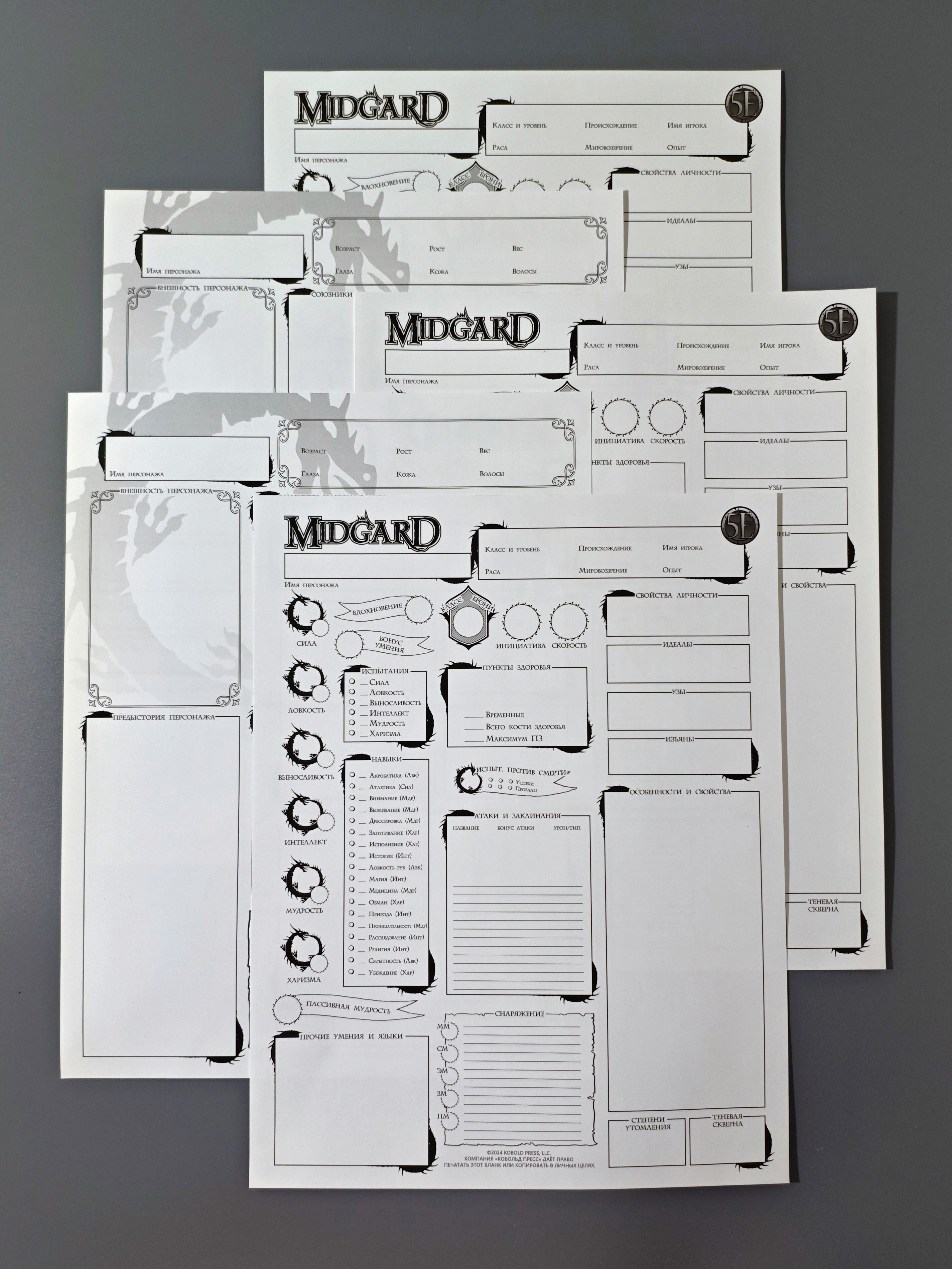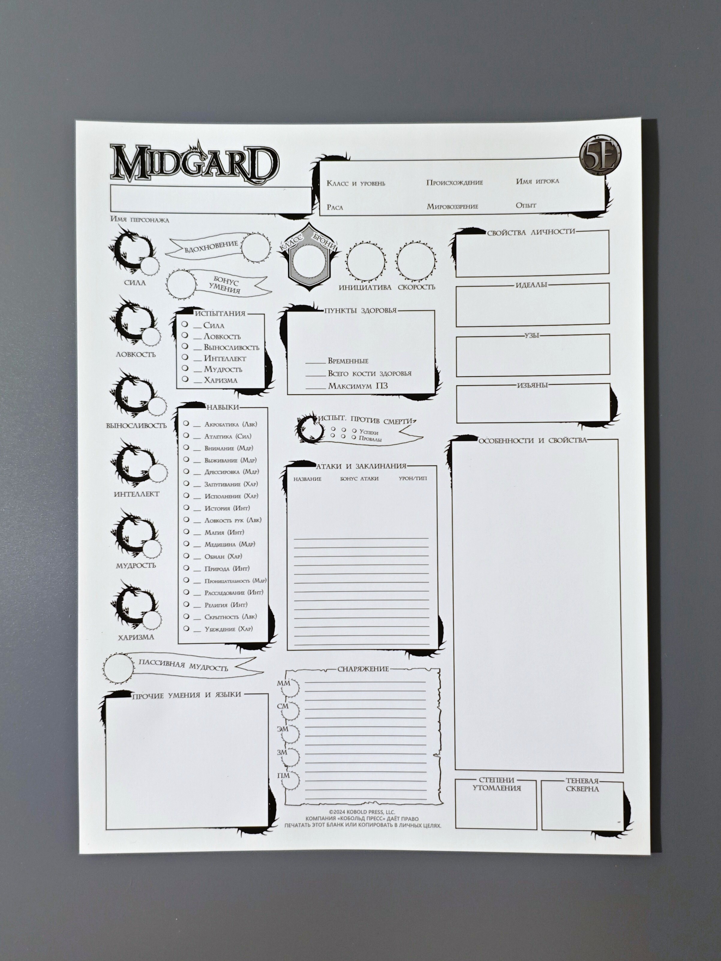 Лист персонажа D&D, выполненный в стиле сеттинга «Мидгард».