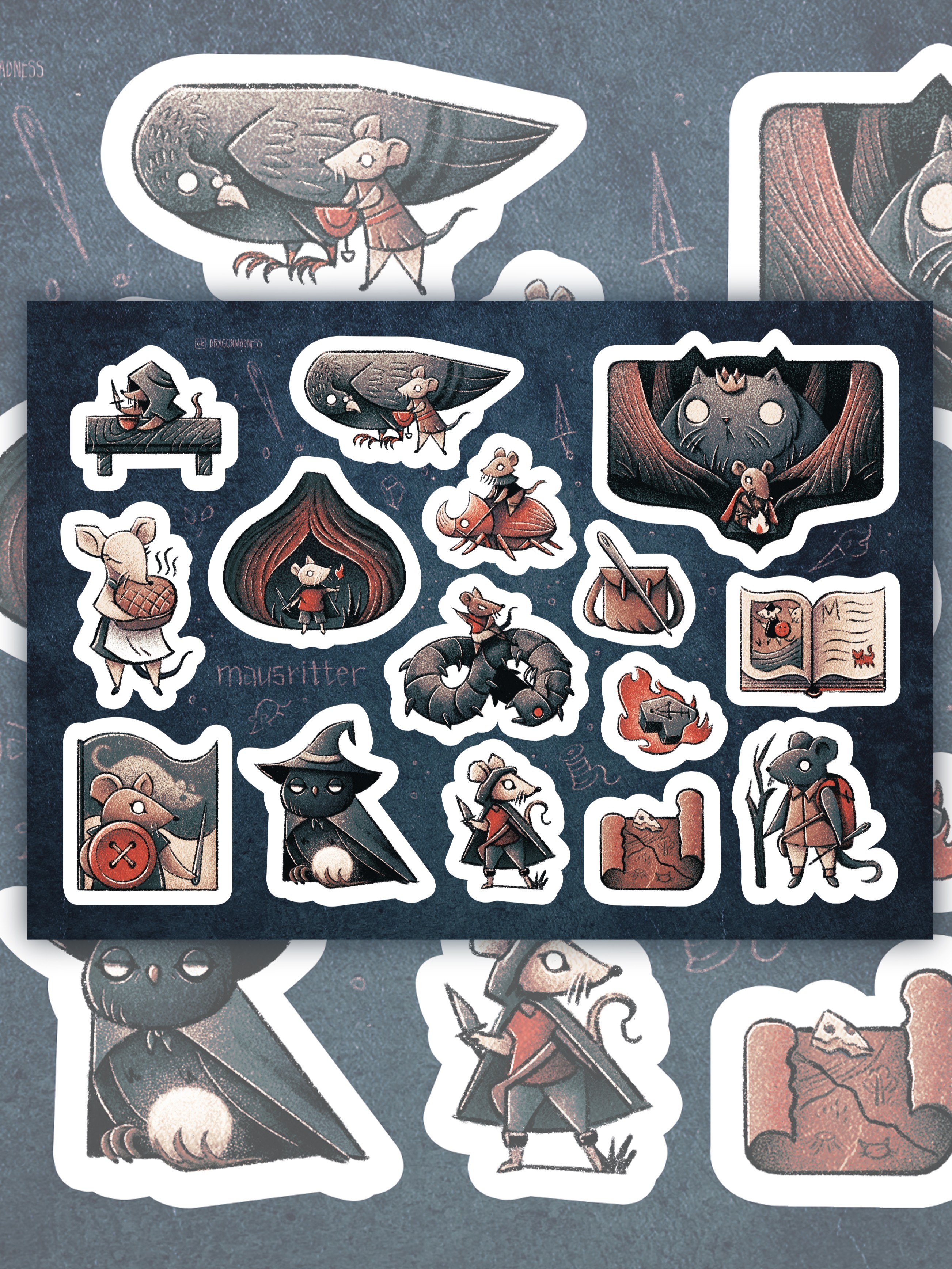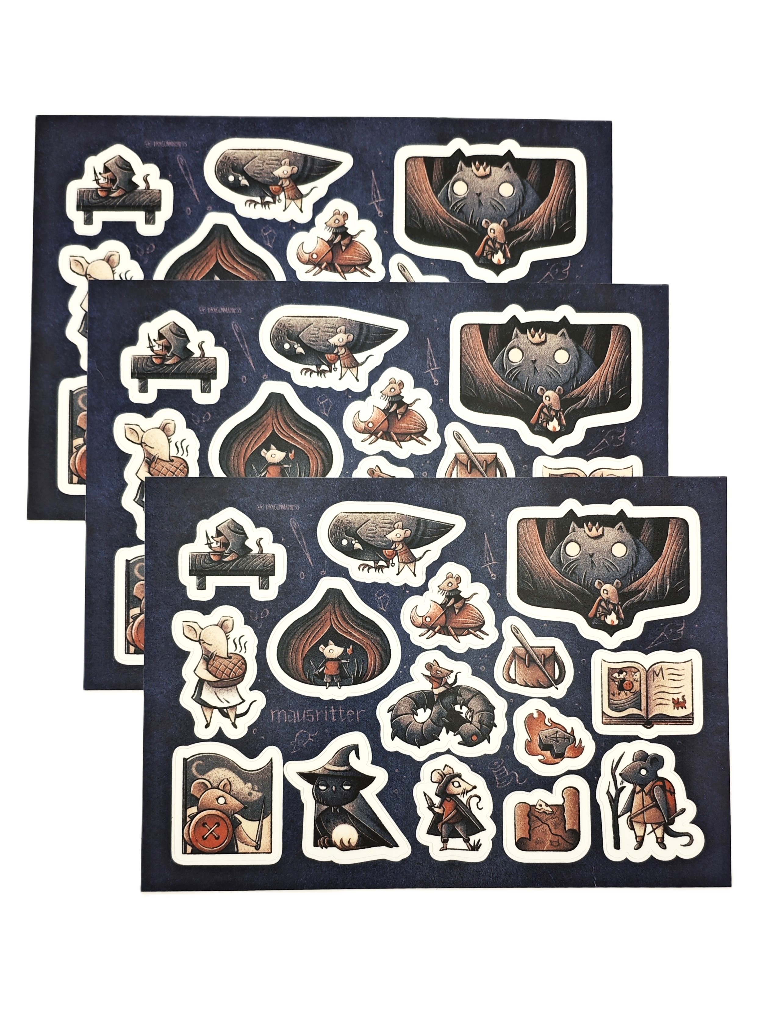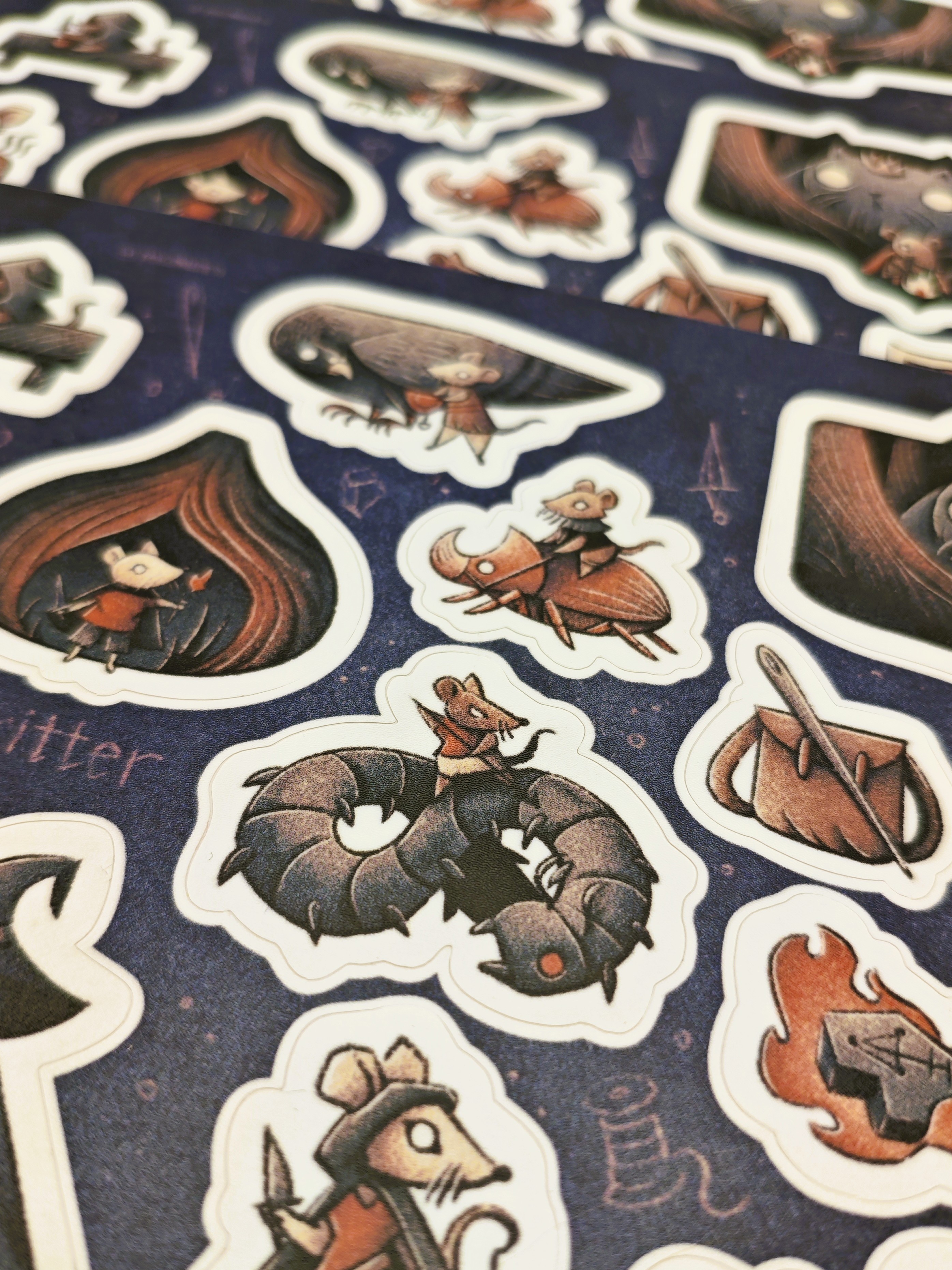 Цветные стикеры, на виниловой плёнке. Иголка вместо шпаги, факел из спички, львиные сердце в мышиной груди.