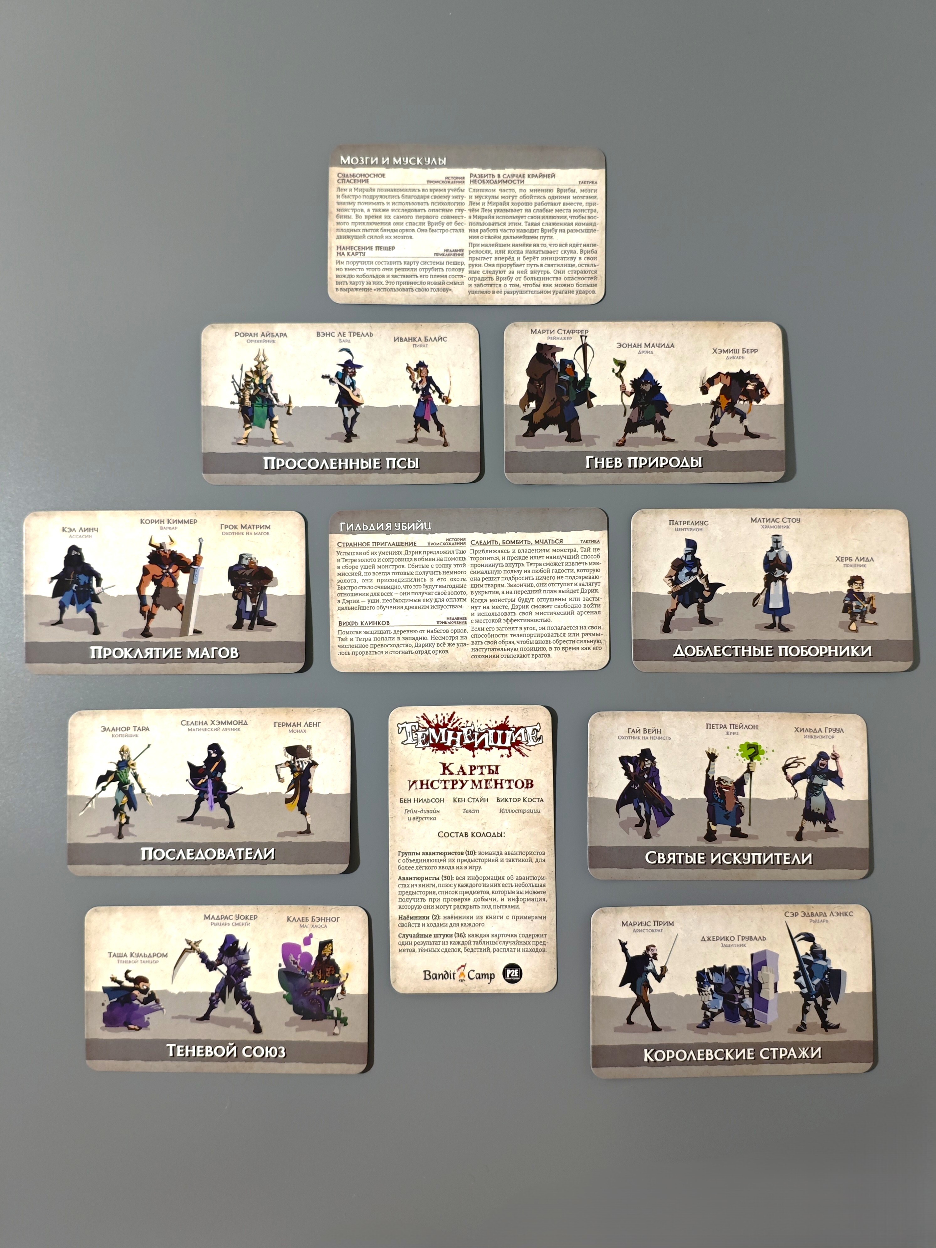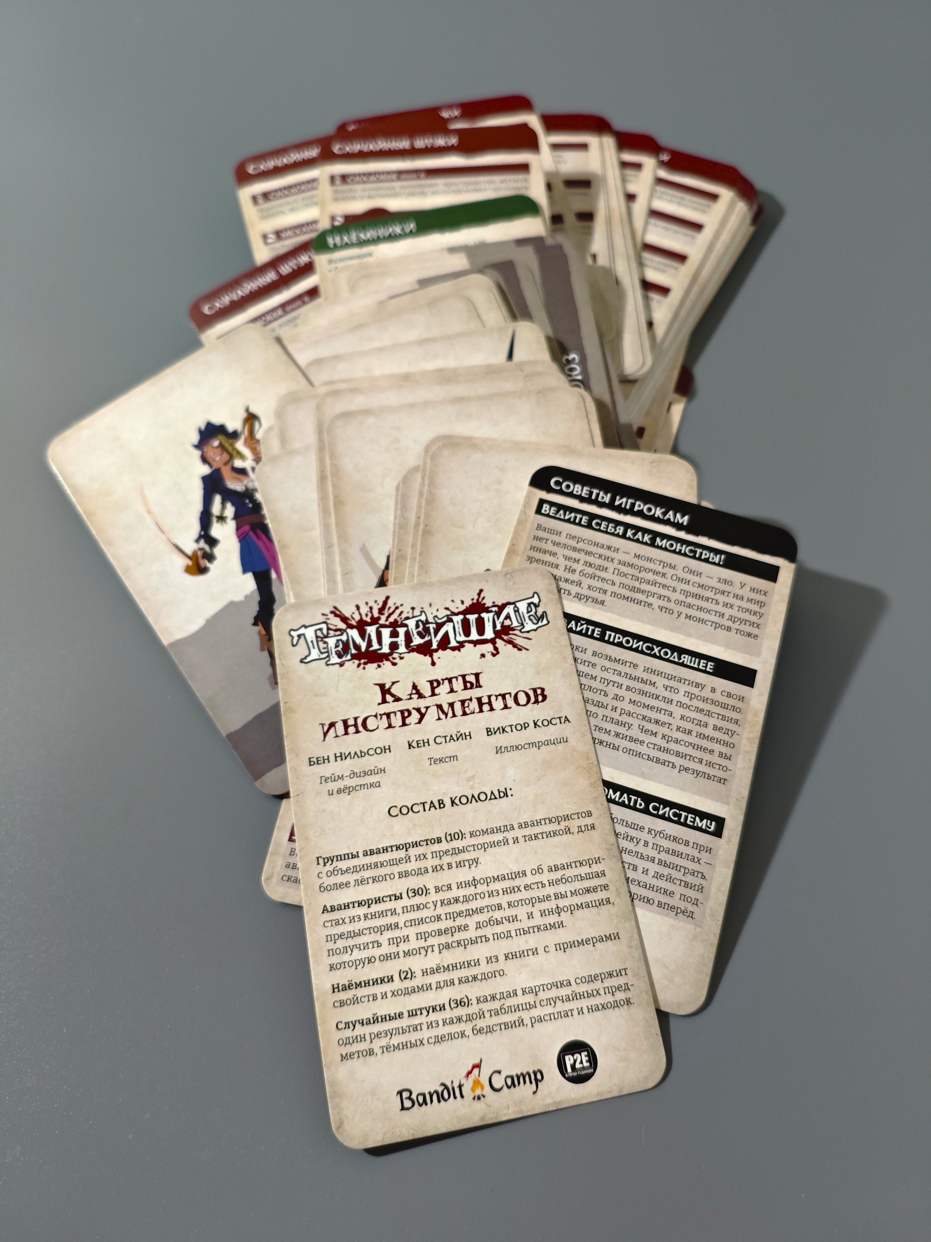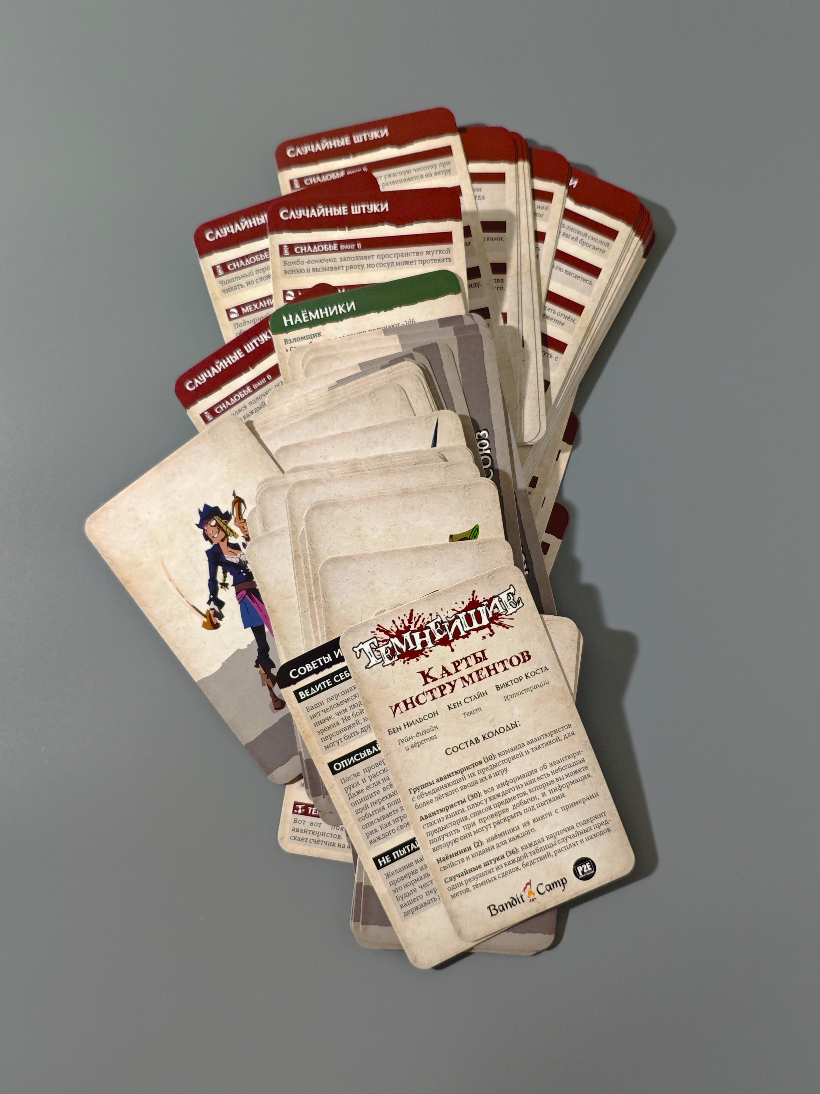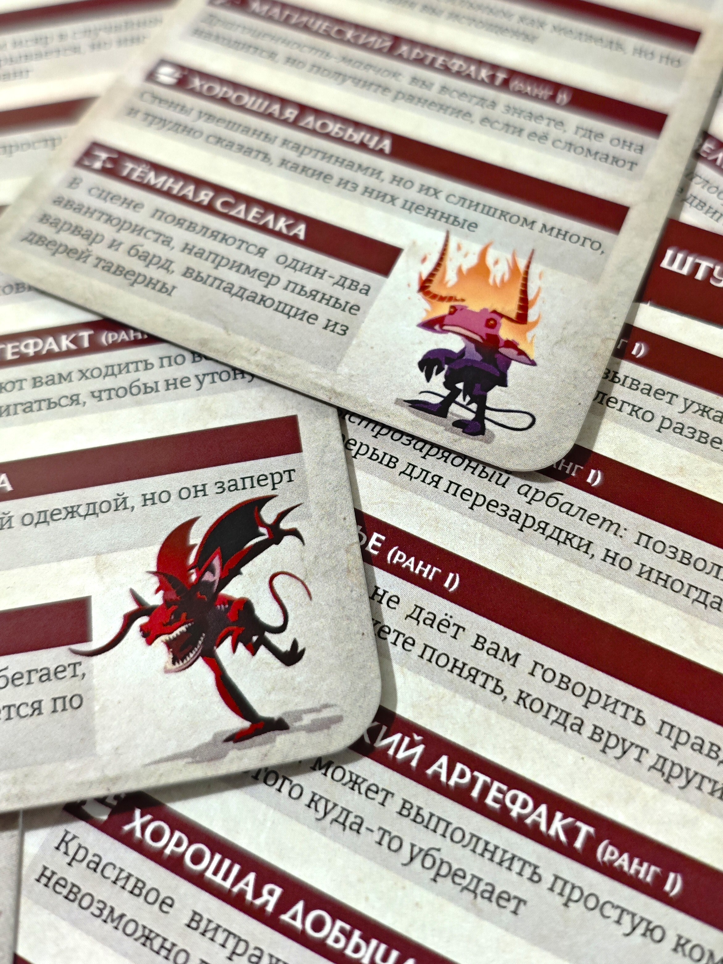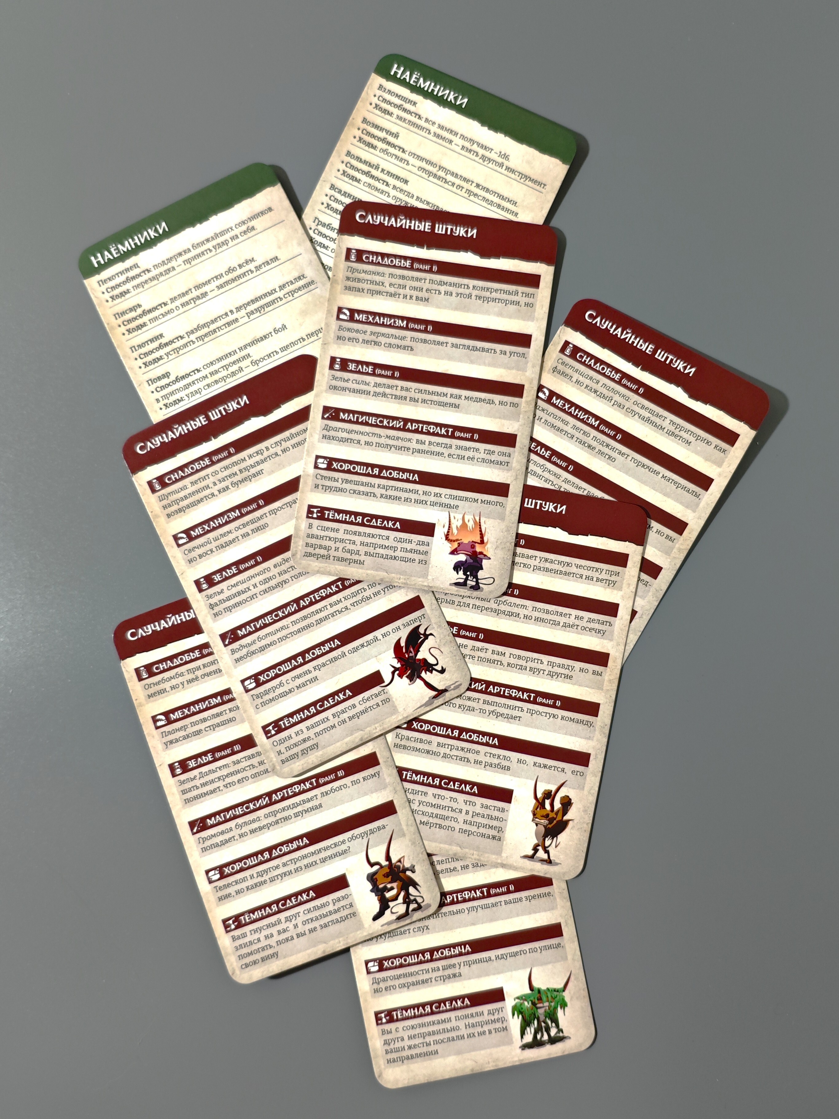 4. Случайные штуки: каждая карточка содержит один результат из каждой таблицы случайных предметов из книги: снадобья, механизмы, зелья, магические предметы. Плюс результаты из таблиц тёмных сделок, находок, бедствий и расплат.
