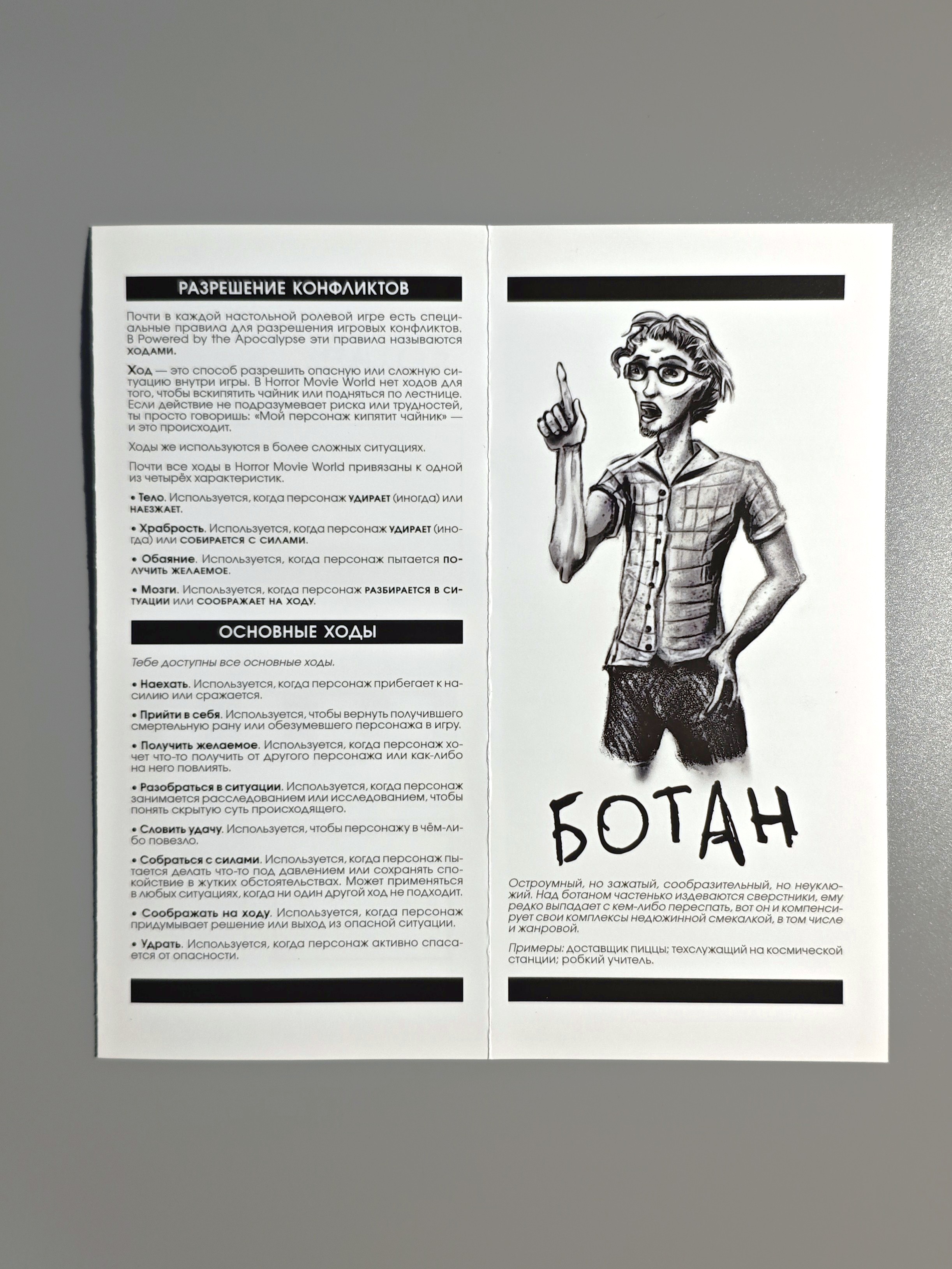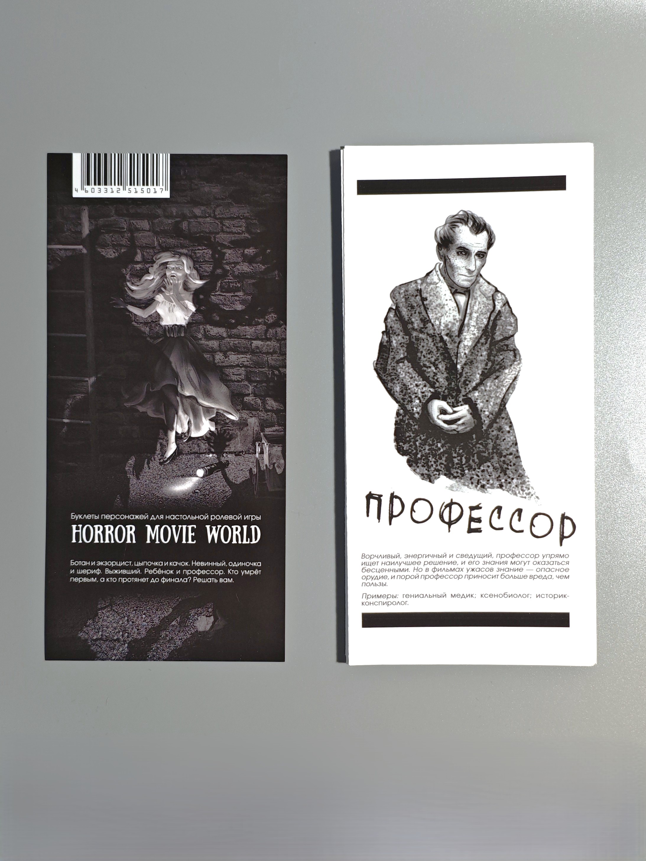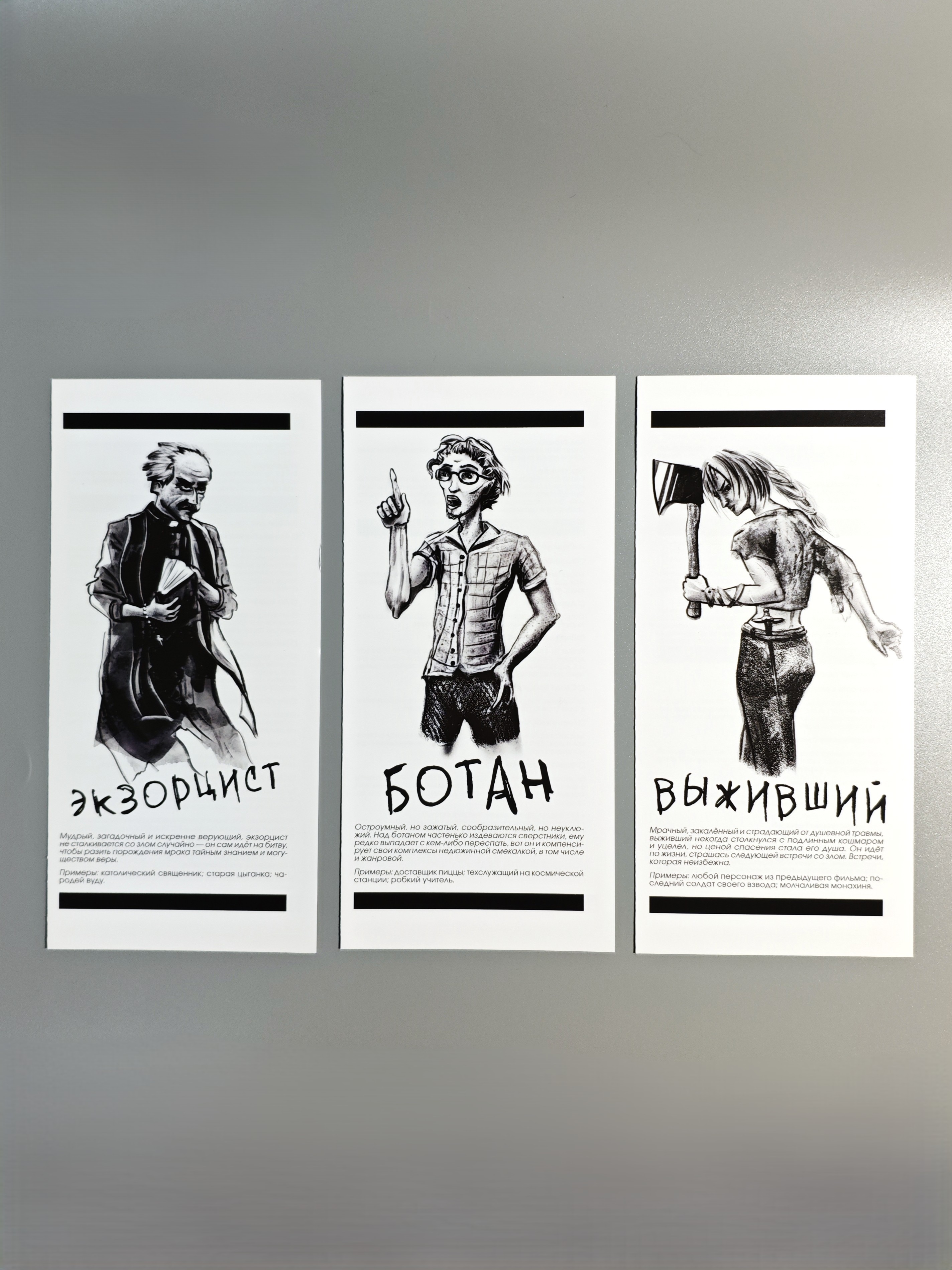 Буклеты персонажей из игры «Мир страшного кино» (Horror Movie World) — это настоящее любовное письмо фильмам ужасов. Каждый из 10 представленных архетипов — яркий, узнаваемый образ, у которого есть множество примеров в кинематографе. В комплект входят все 10 буклетов!