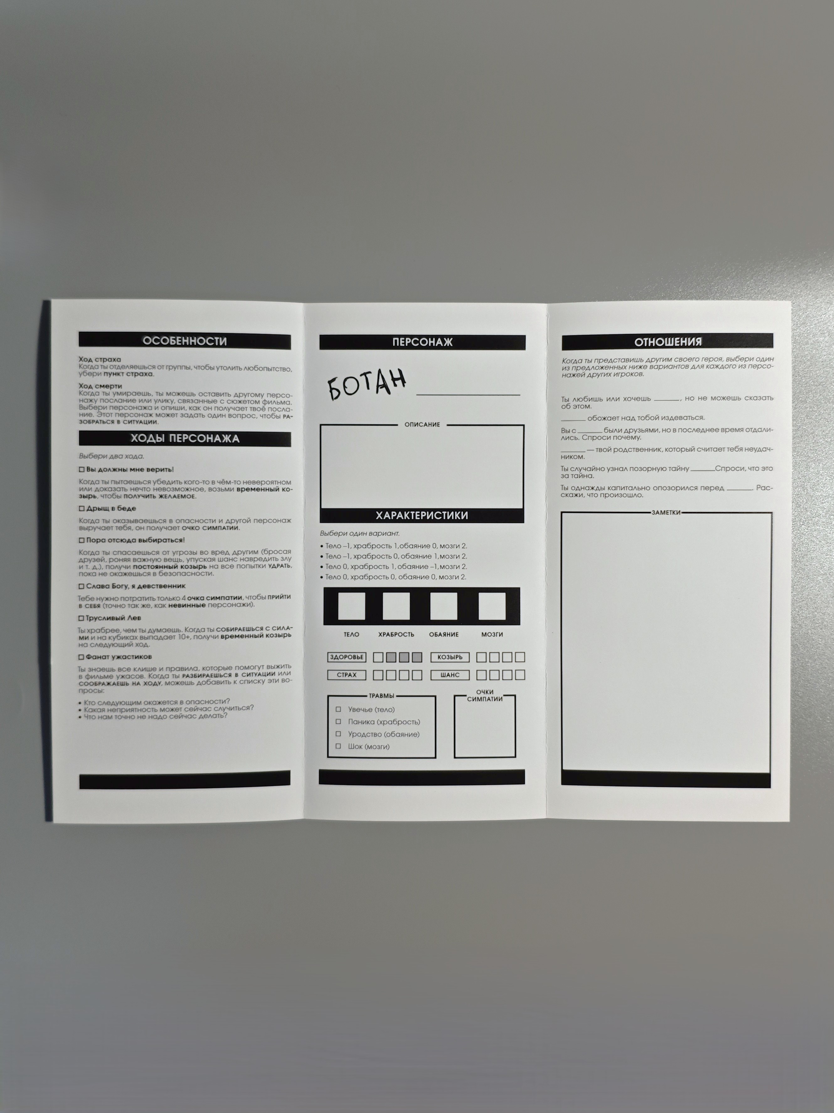 За броскими названиями скрываются объёмные персонажи, вдохновлённые сотнями просмотренных фильмов. Их можно и нужно настраивать по собственному вкусу. Буклеты изданы в формате триплетов. В сложенном виде их размер примерно равен половине листа A5