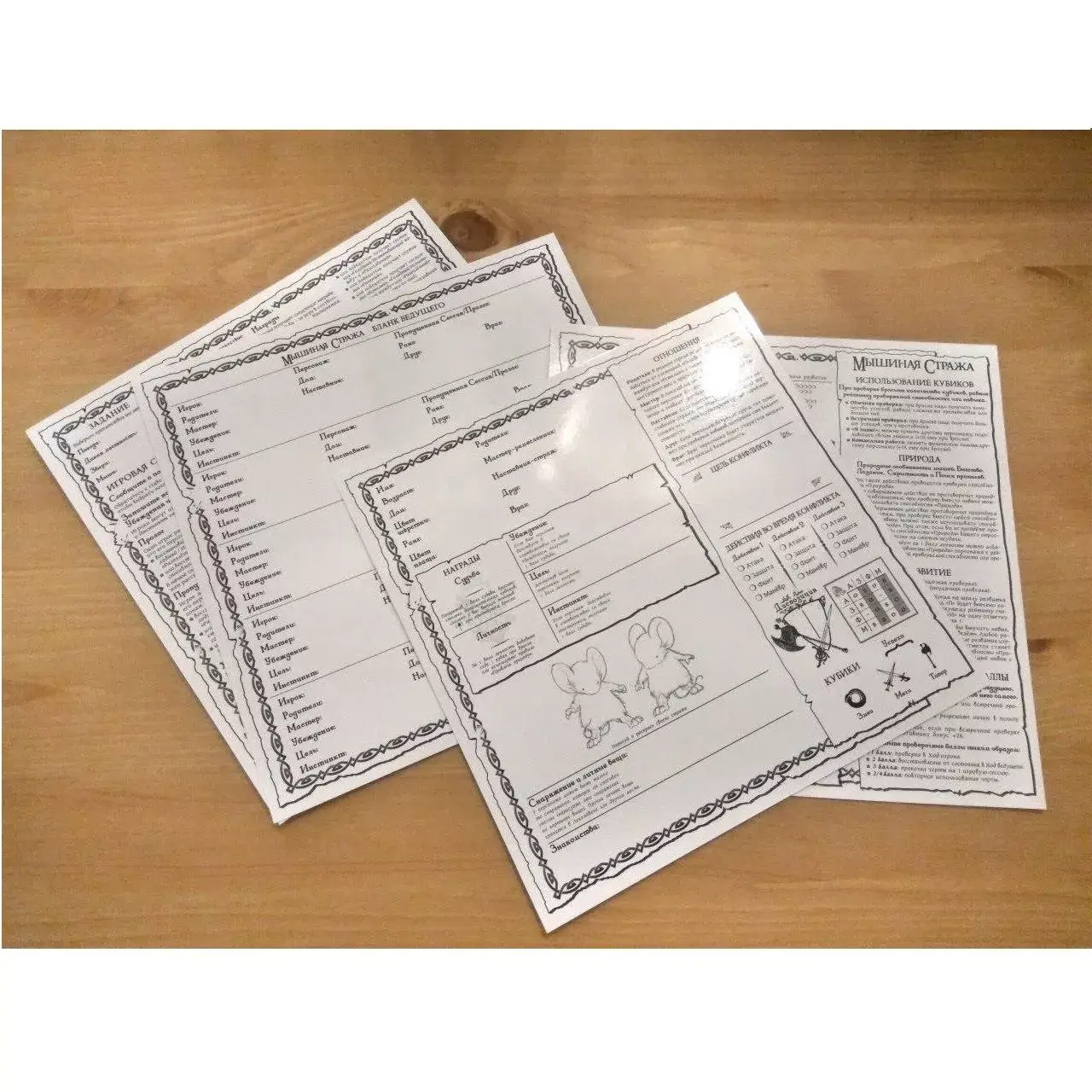Набор многоразовых бланков к игре «Мышиная стража». В набор входит 5 бланков персонажей и 1 бланк ведущего.