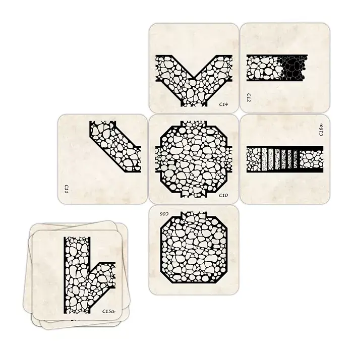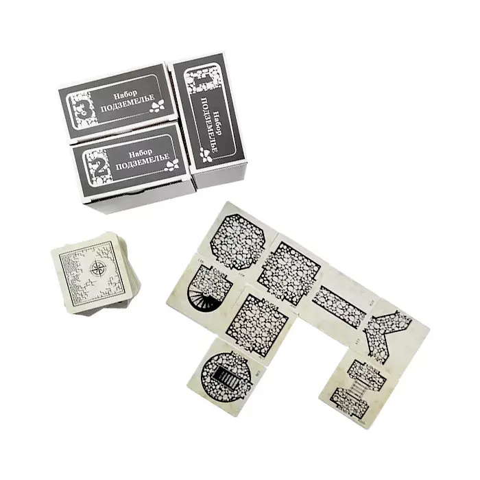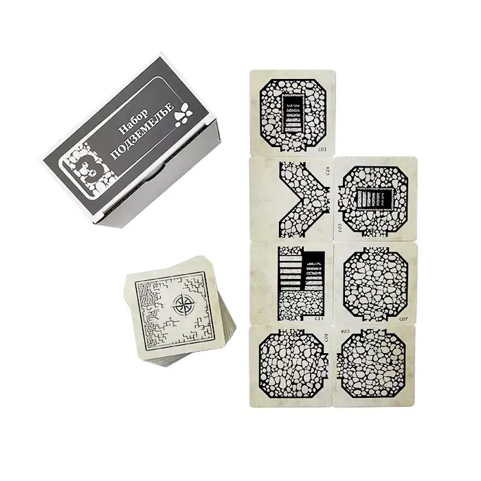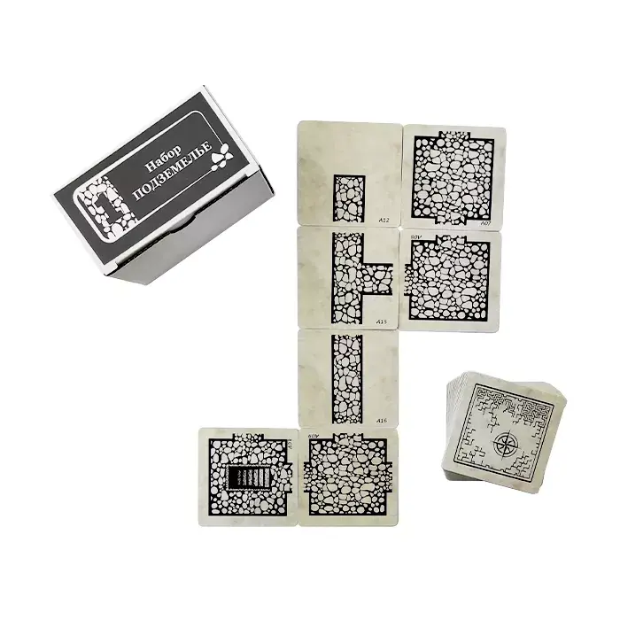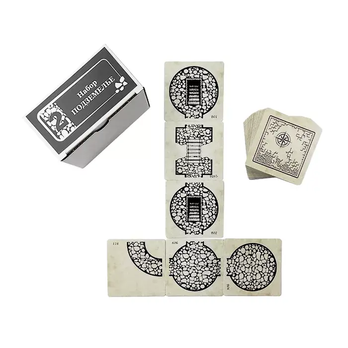 Колода имеет условный масштаб, поэтому вы можете разложить как гигантское подземелье, так и небольшое. Карты ламинированные, что позволяет ставить отметки (о ловушках, сокровищах, оставшихся телах, открытых и закрытых дверях, люках и т.д.) маркером на водной основе, а затем стирать их.