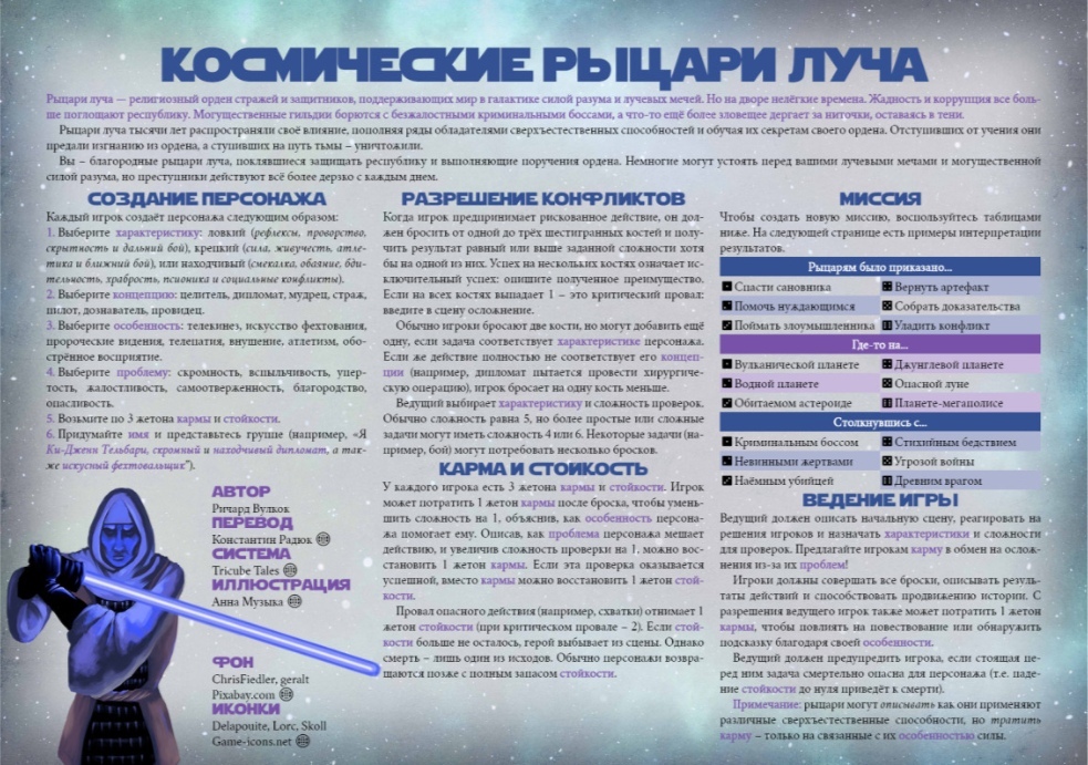 Одностраничная игра на основе системы Tricube Tales, вдохновлённая (и написанная как оммаж) знаменитой космооперой о героях далёкой-далёкой галактики. На первой странице содержится всё необходимое для игры, а вторая страница дополняет конструктор приключений примерами его использования и сюжетных поворотов.