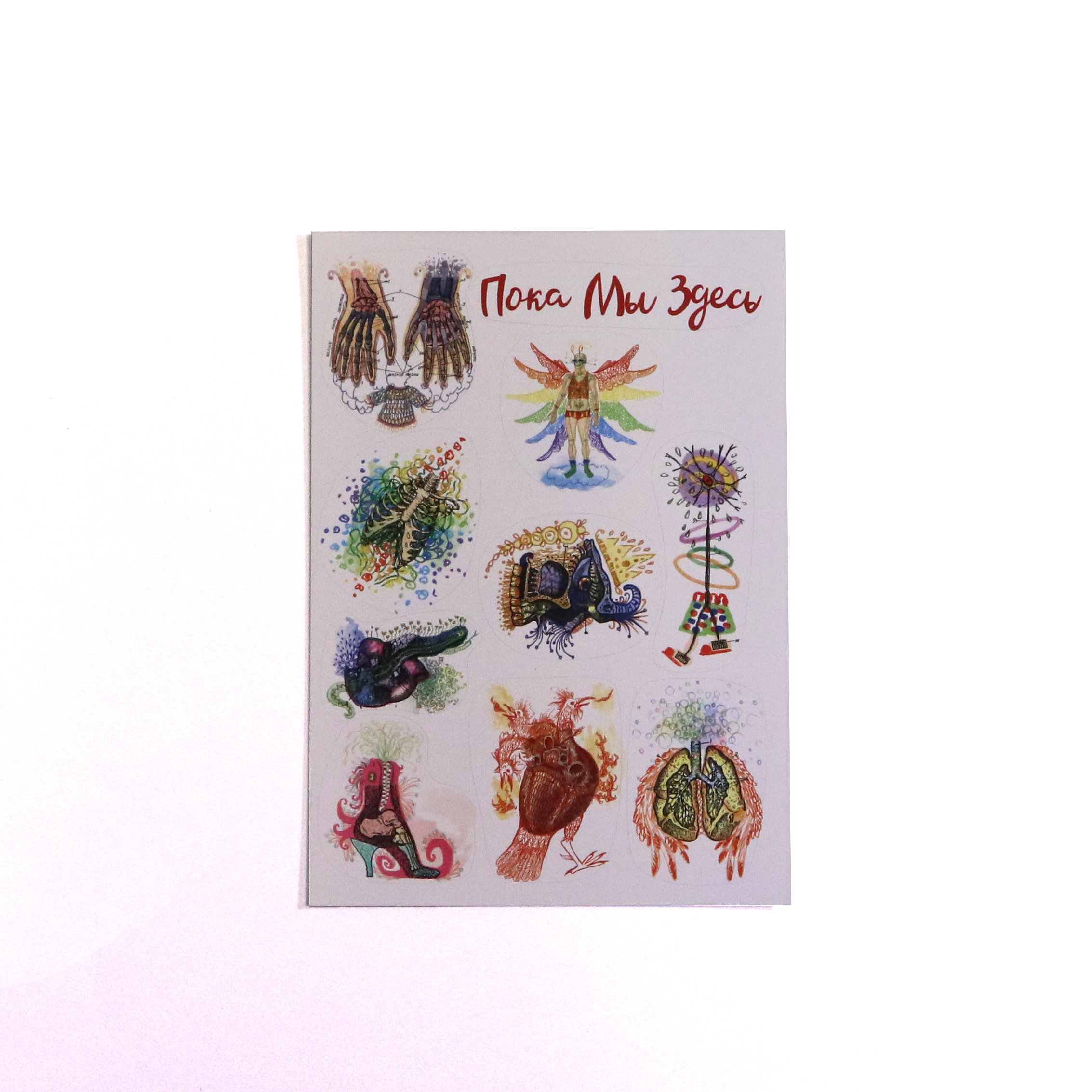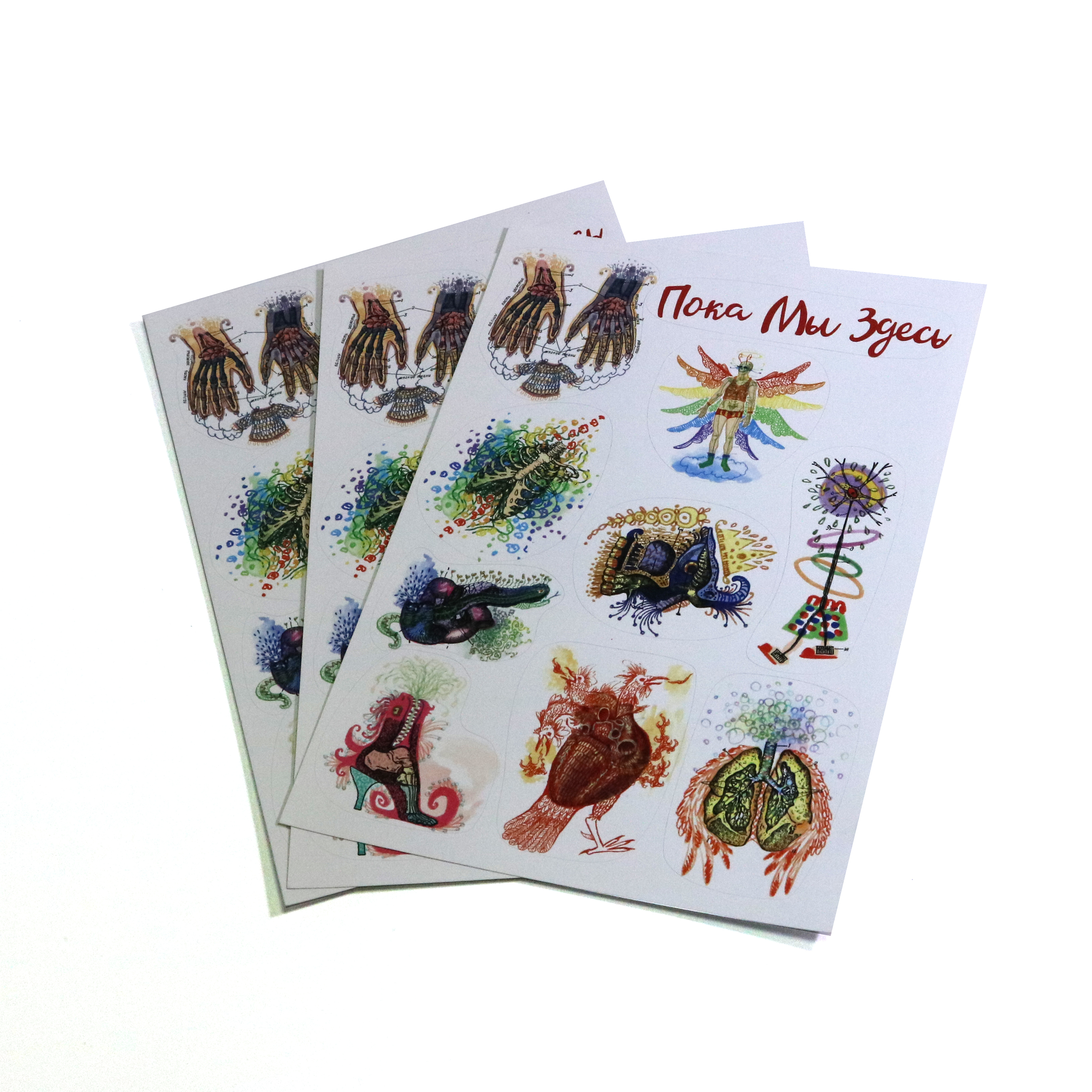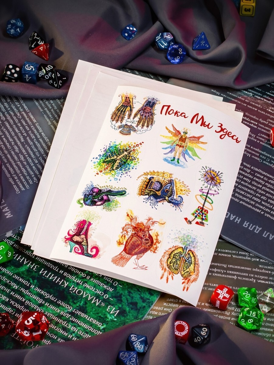 Великолепные, яркие стикеры с иллюстрациями к настольной ролевой игре «Пока мы здесь». Ваши органы ещё никогда не умирали так красиво!