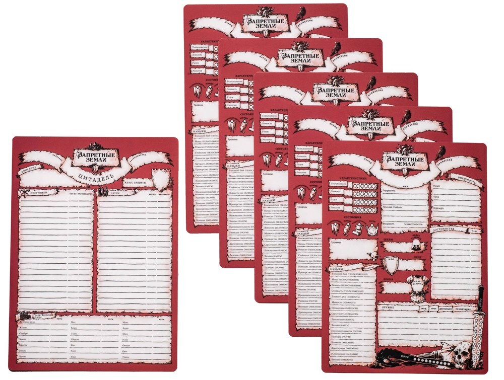 Комплект включает в себя пять листов персонажей и один лист цитадели. Как и всегда, основное удобство бланков заключается в том, что они во-первых уже распечатаны и готовы к игре, а во-вторых подходят для многократного использования (о-о-очень многократного, если быть точнее).