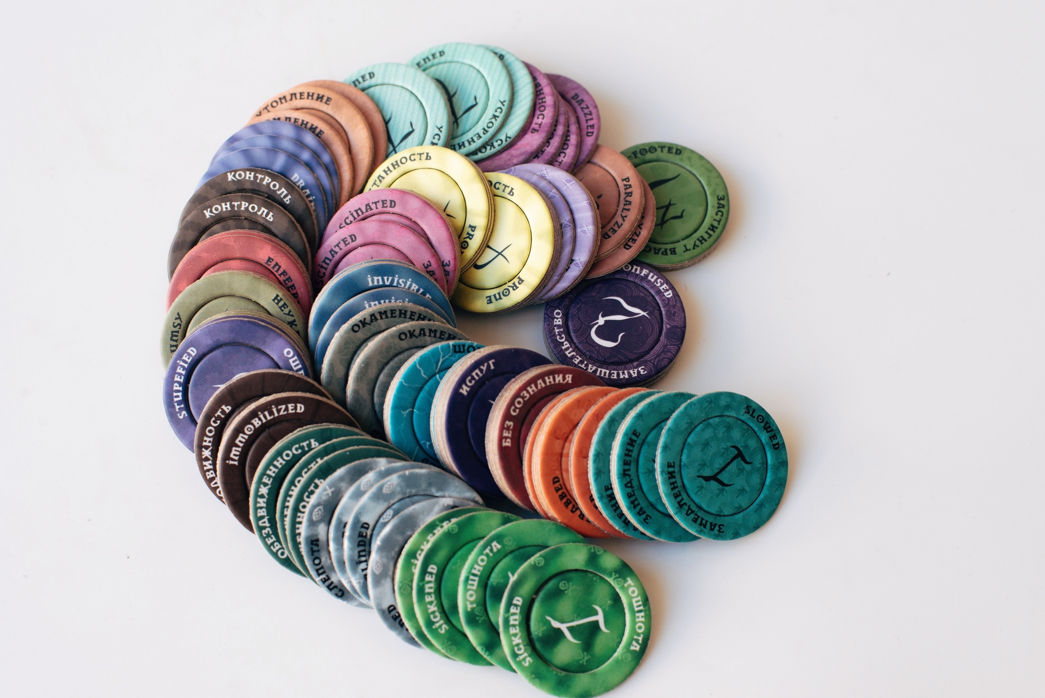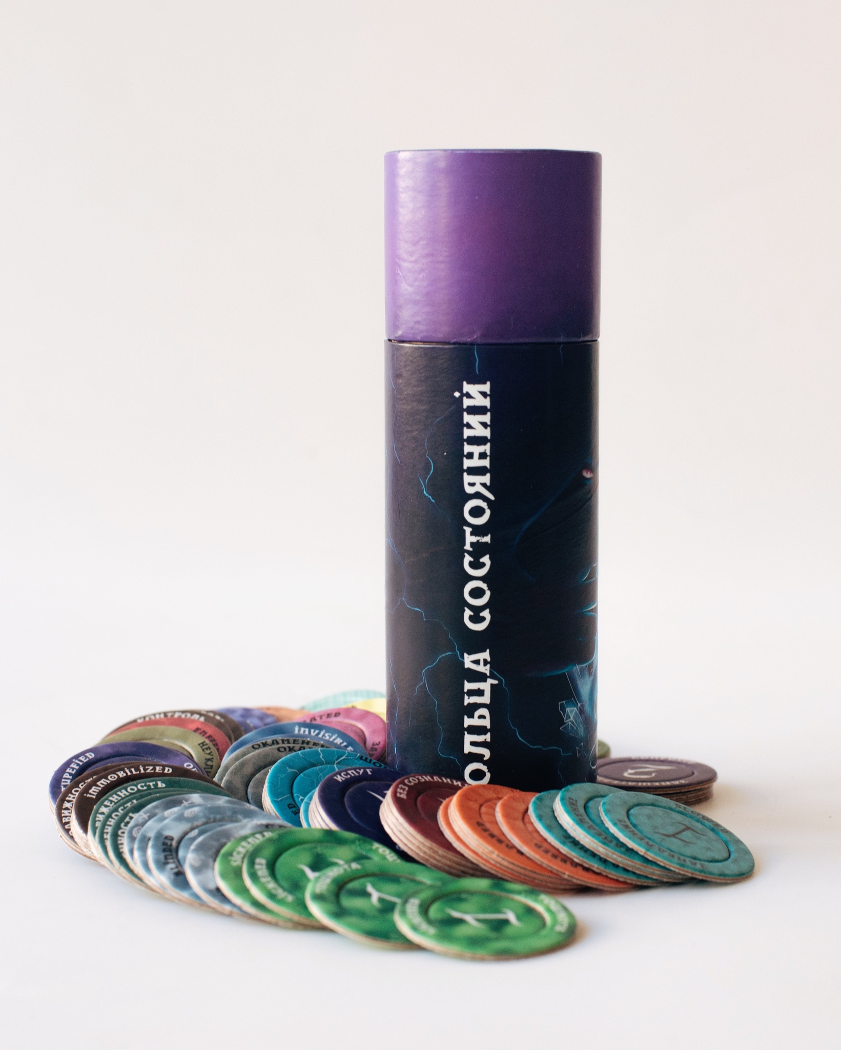 Набор из 100 колец — 25 состояний по 4 штуки каждого вида. А также 100 жетонов ячеек заклинаний с 1 по 10 круг, которые также могут быть жетонами пунктов фокуса. Набор упакован в фирменный тубус. Подходит для игр Pathfinder и D&D пятой редакции.